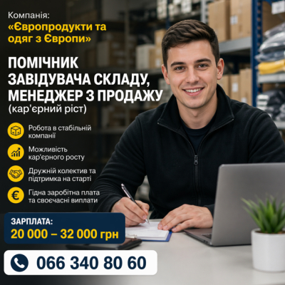 Фірма «Євротовари» запрошує хлопця на позицію менеджера, помічника по складу з гарною перспективою розвитку.
